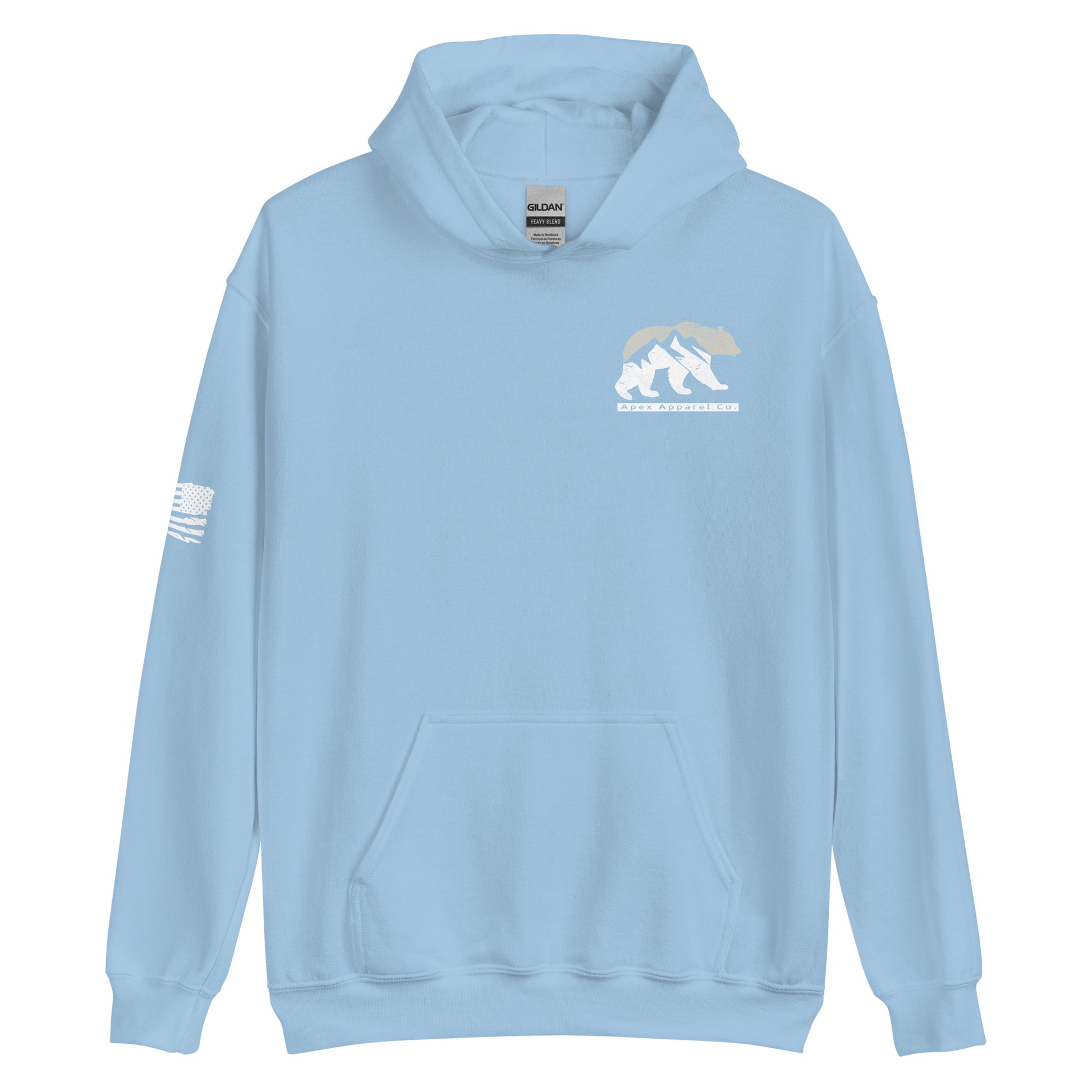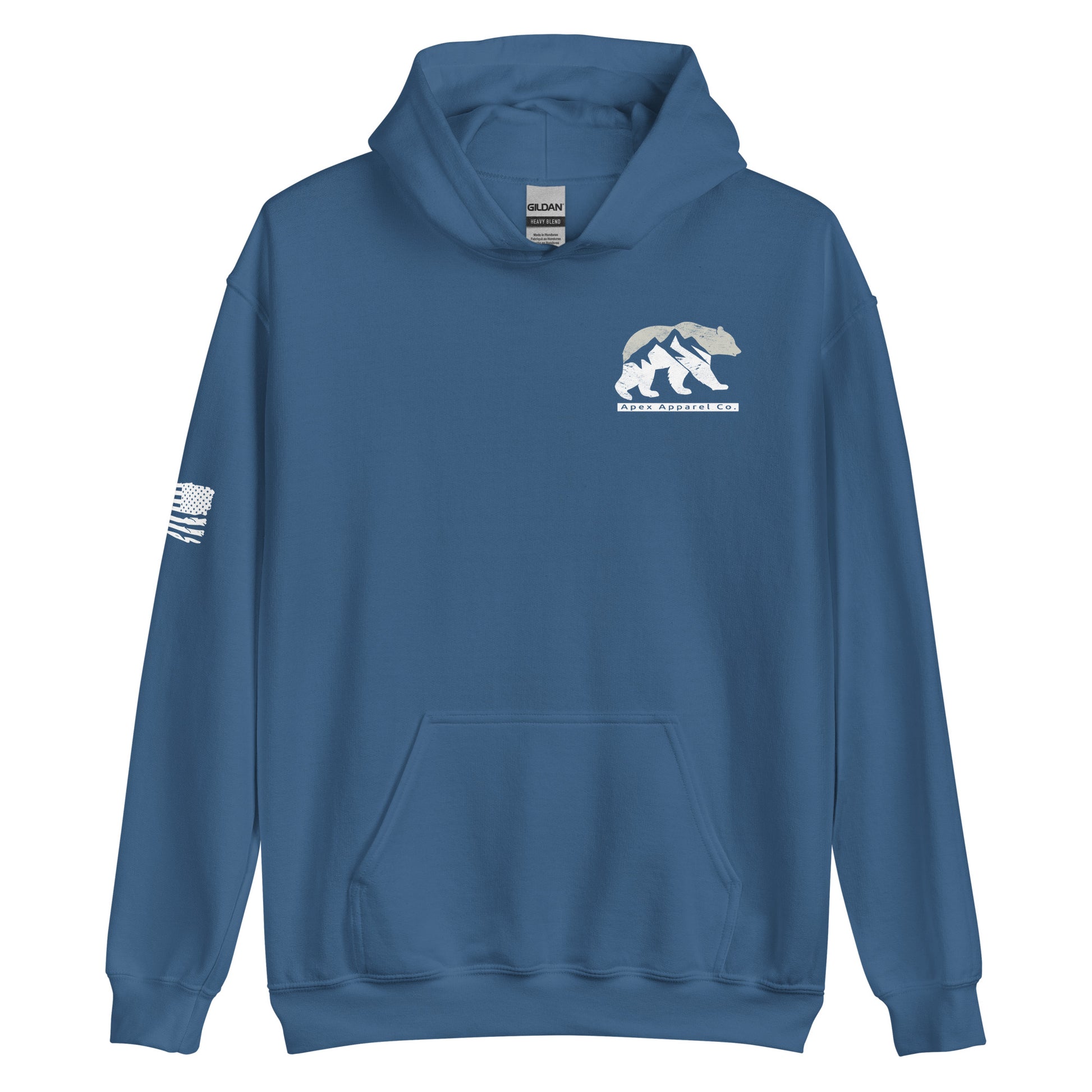 Elevate your wardrobe with this exceptional hoodie. Crafted with precision, it features the striking Apex Apparel Logo on the back, proudly displaying your commitment to excellence. The AACo Logo on the front adds a touch of sophistication, and the Apex Mountain on the left sleeve represents your pursuit of new heights. The distressed US flag on the right sleeve is a symbol of your unwavering patriotism.