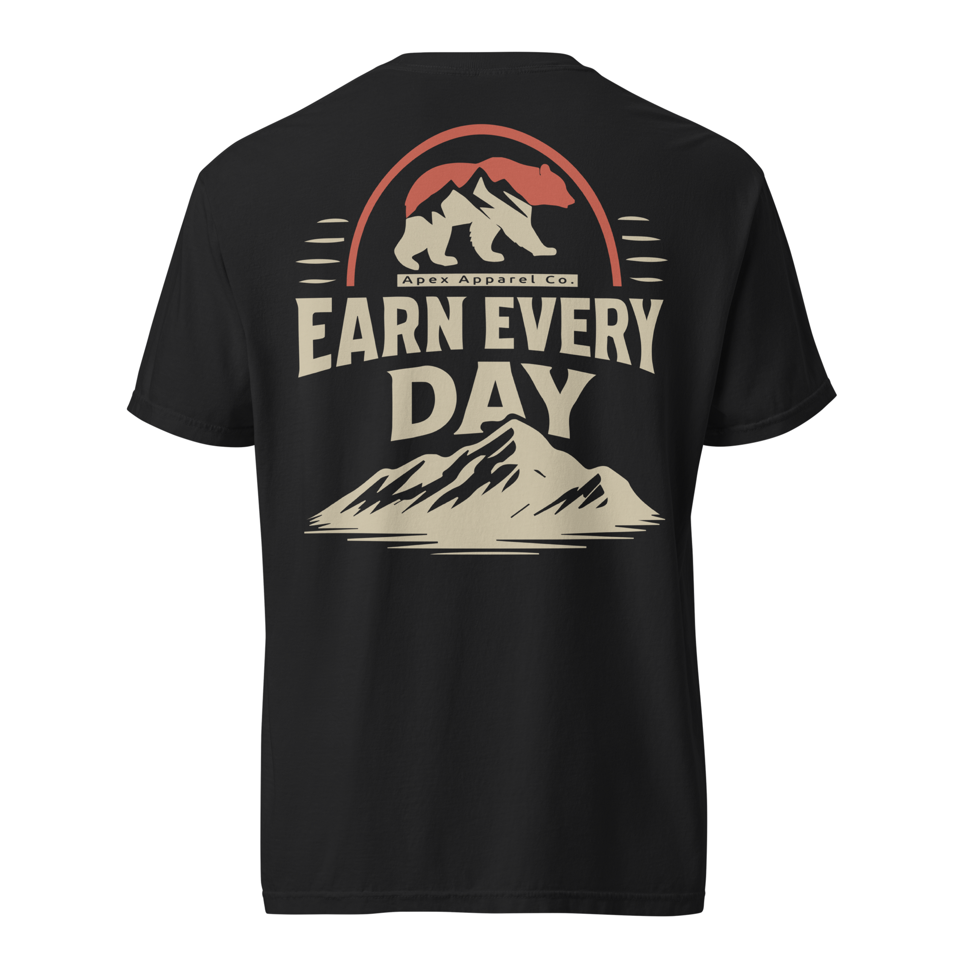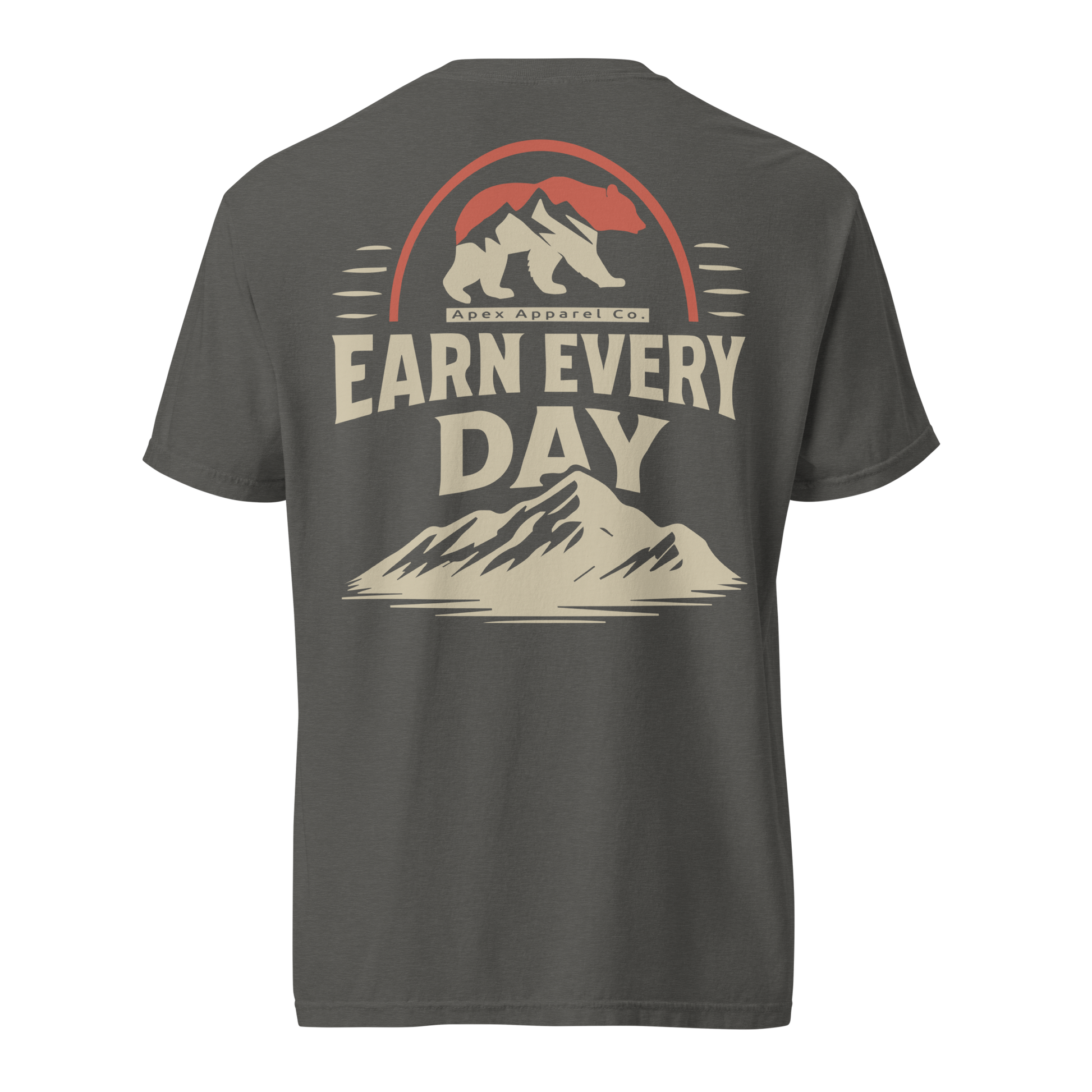 The Earn Every Day Tee is not just a shirt—it's a mentality stitched into the fabric. Featuring the Apex Bear on a relentless climb and a mountain forged under pressure, this design is a battle cry for those who wake up to win, not whine.