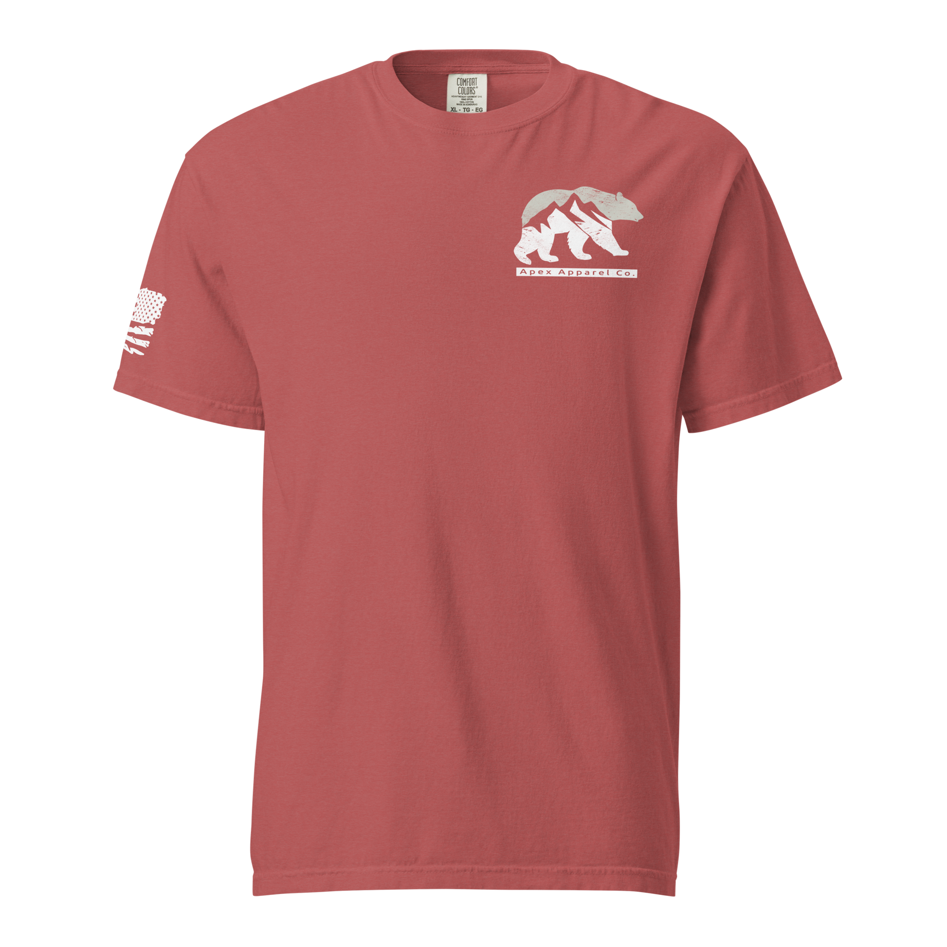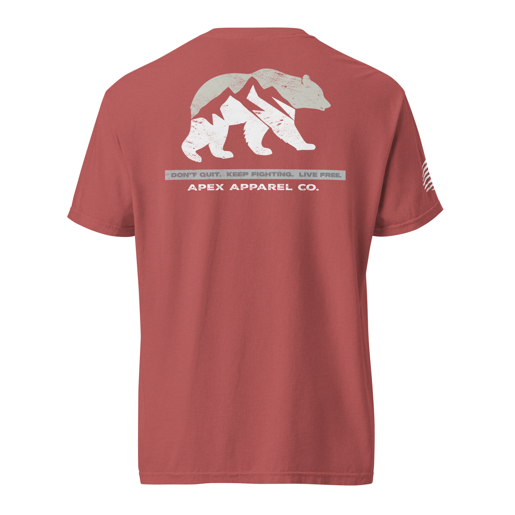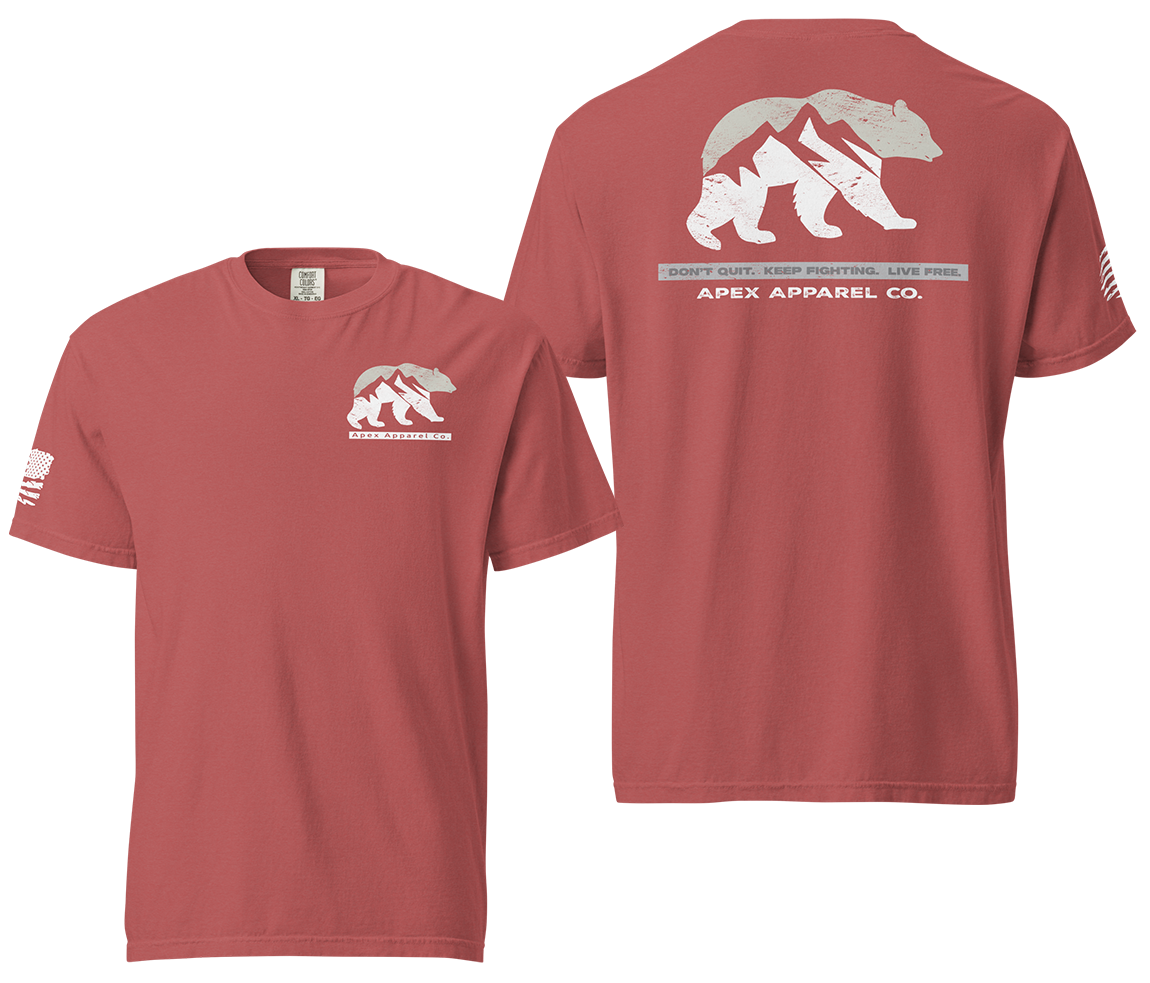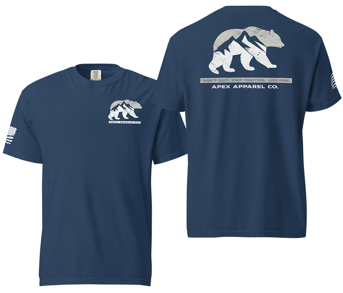 Our new bear logo, featuring the Apex Apparel Mountain embedded within, symbolizes strength and the relentless spirit to overcome obstacles. With the powerful message "DON'T QUIT. KEEP FIGHTING. LIVE FREE." emblazoned on the back, this shirt serves as a constant reminder to push boundaries and live life on your own terms.