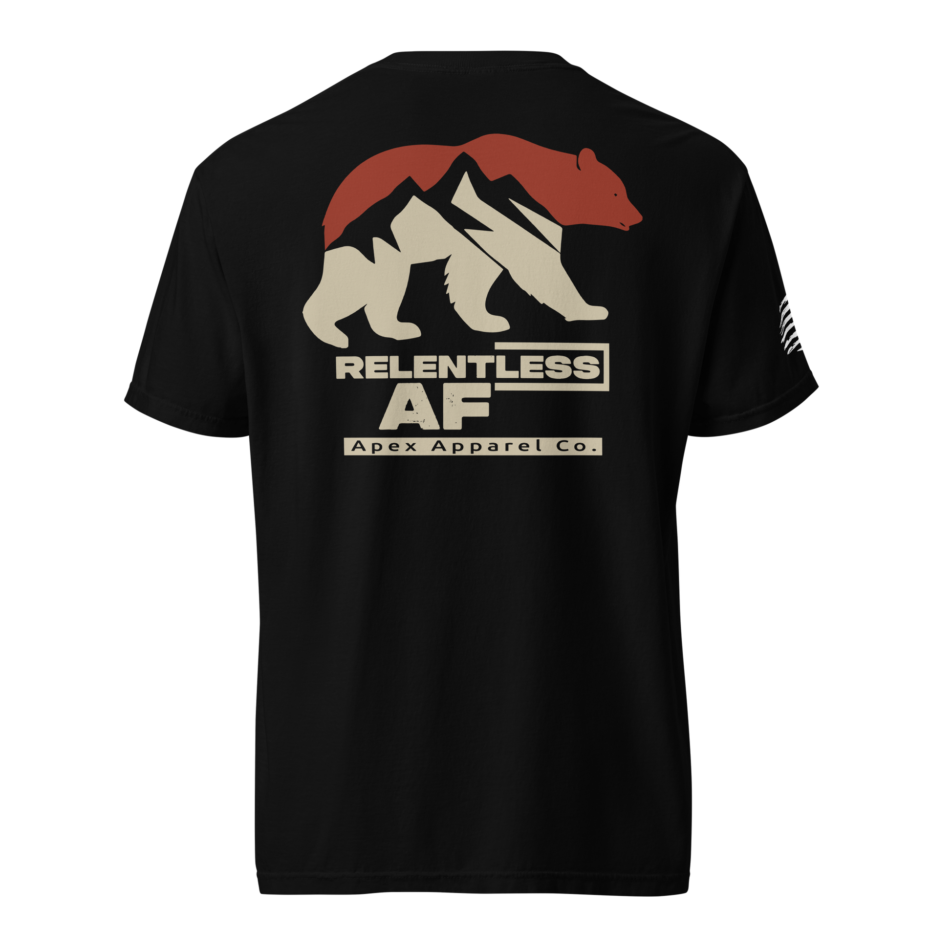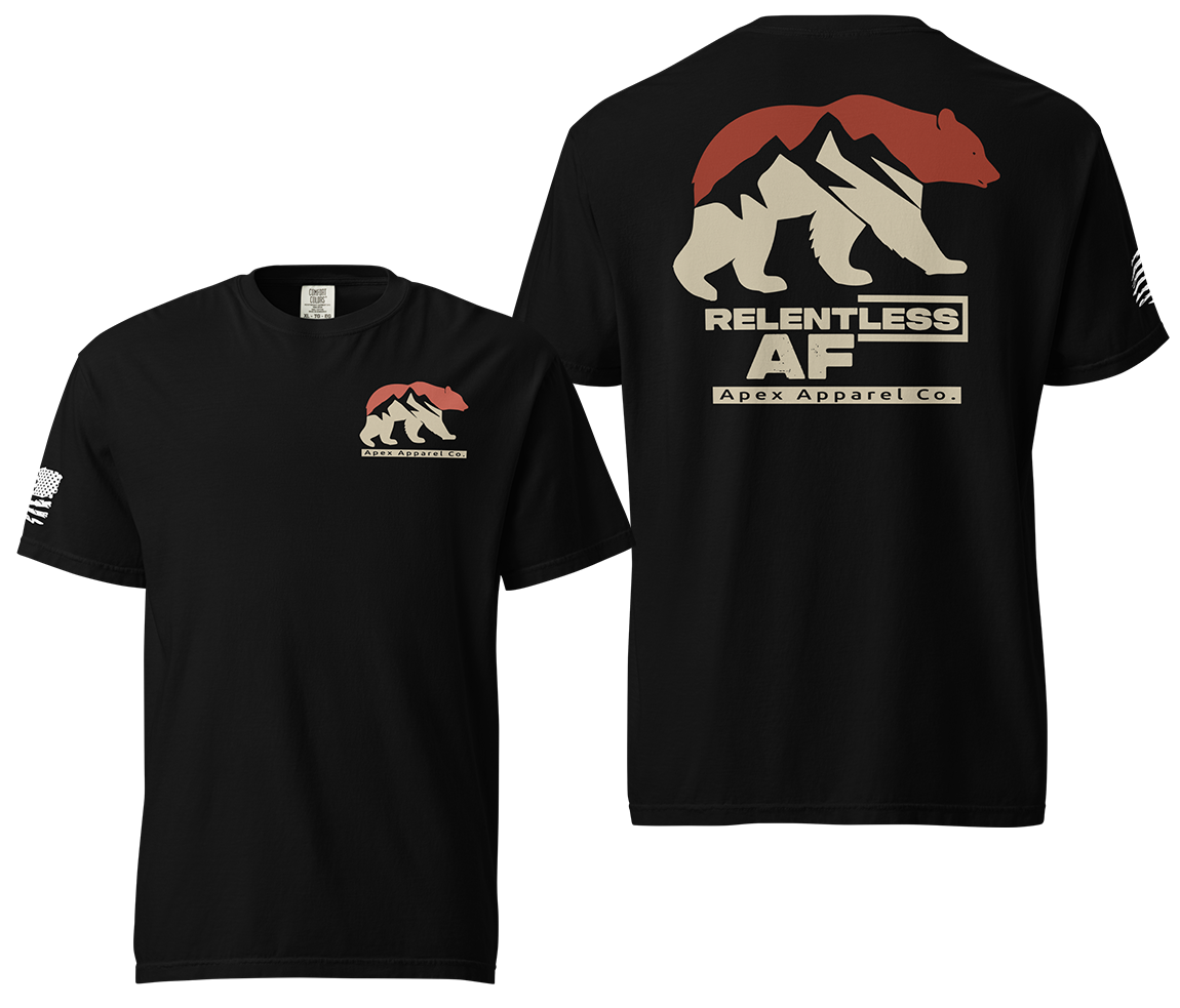 Embrace the spirit of relentless determination with our latest design, the "Relentless AF" T-Shirt. Featuring a powerful bear with the iconic Apex Apparel Mountain embedded within, this shirt is not just a piece of clothing—it's a statement.